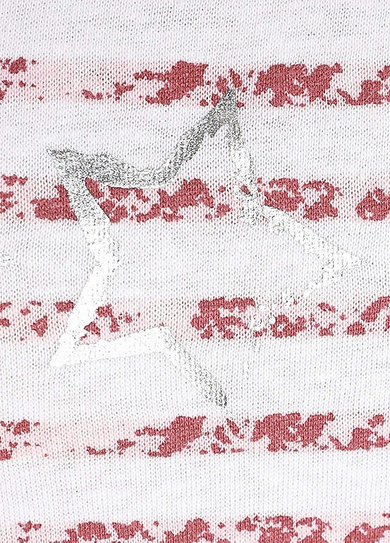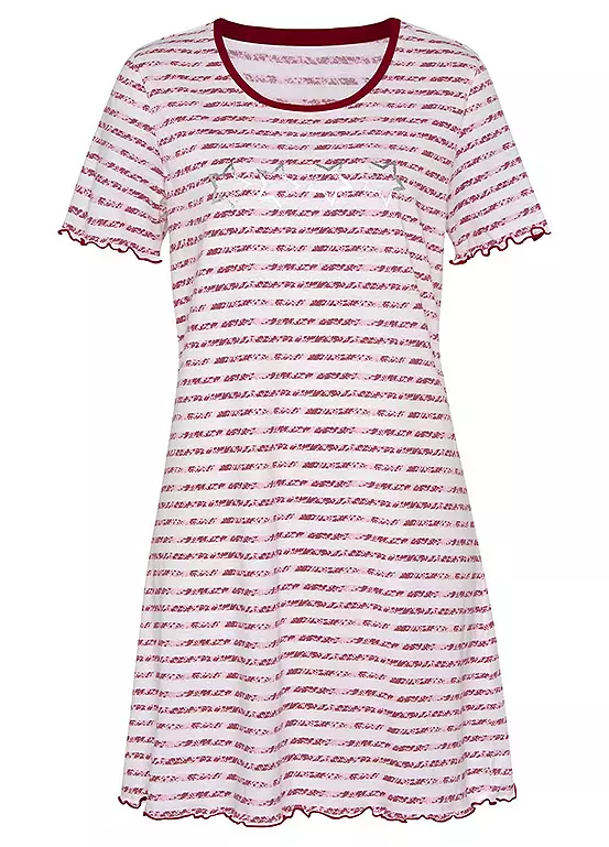 Vivance Dreams Stripe Short Sleeve Ruffle Hem Nightie is the perfect sleepwear for your sweet dreams! This nightie comes with a stripe design and a foil print at the front. With short sleeves and a round neckline, it’s made of pure cotton and features babylock edges on the hem and sleeve hem for a delicate finish. Go ahead, give your dreams a stylish edge! Nightie with stripe design and foil print at the front. With short sleeves and a round neckline. Soft single jersey made of cotton.