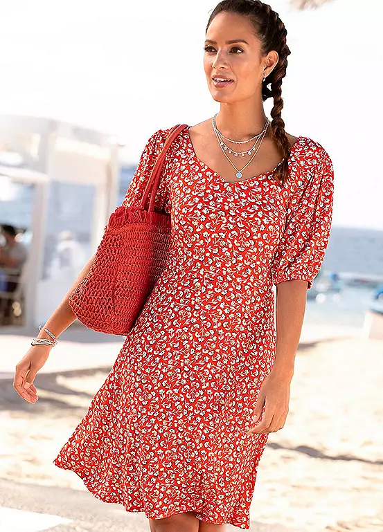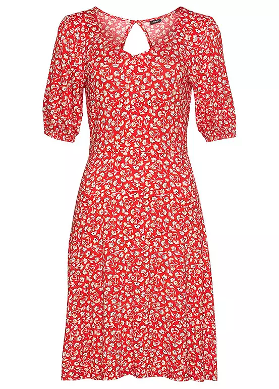 A classic floral summer dress that conjures up a feminine look. It has a playful neckline at the front, with a cut-out detail on the neck and button closure. The short sleeves with stretch completes the design. Wear with a fun summer hat and stylish accessories to complete the look. Short sleeves with stretch Button fastening in the neck Cut-out detail on the back Length approx. 90 cm (35½ in).