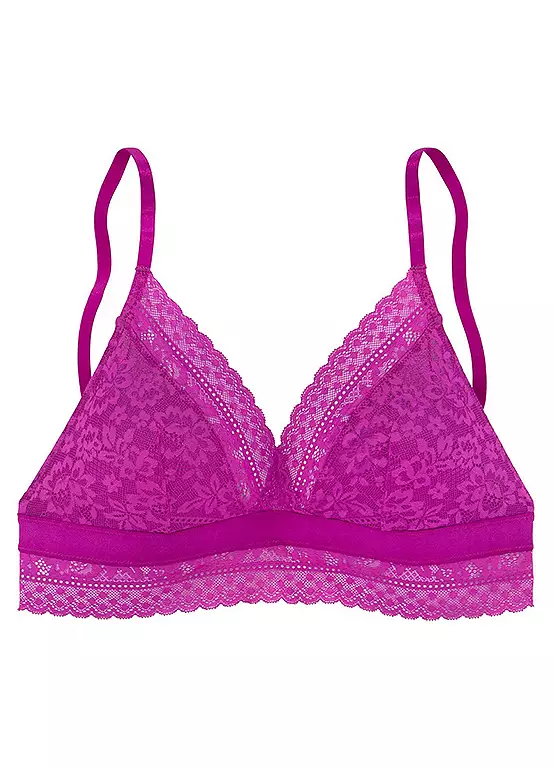 This feminine lace triangle bra is non wired with a satin underbust band. Adjustable straps with hook and eye back fastening.