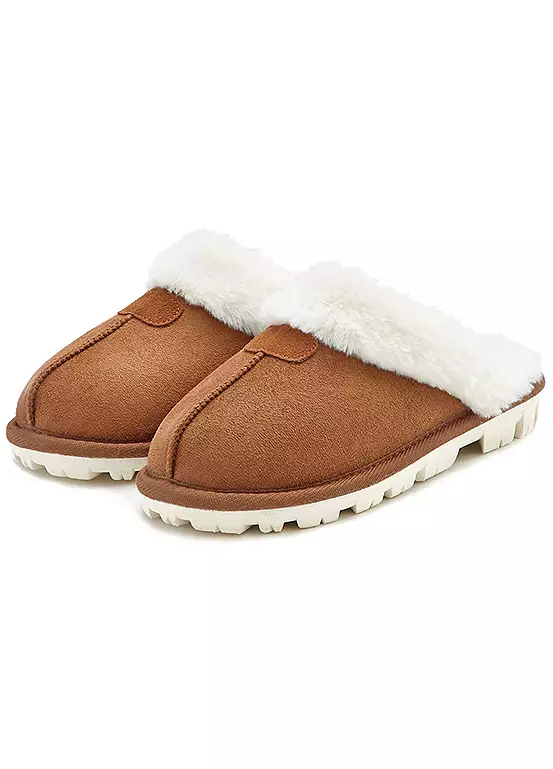 Plush slippers made with cosy faux fur, along with a soft and warming lining. Synthetic outsole.