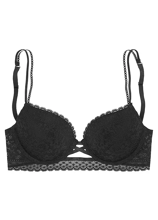 Feminine push-up bra with removable padding, while the cups and underbust band feature partially recycled lace in a floral look. Finished with adjustable straps and back closure. Removable padding.