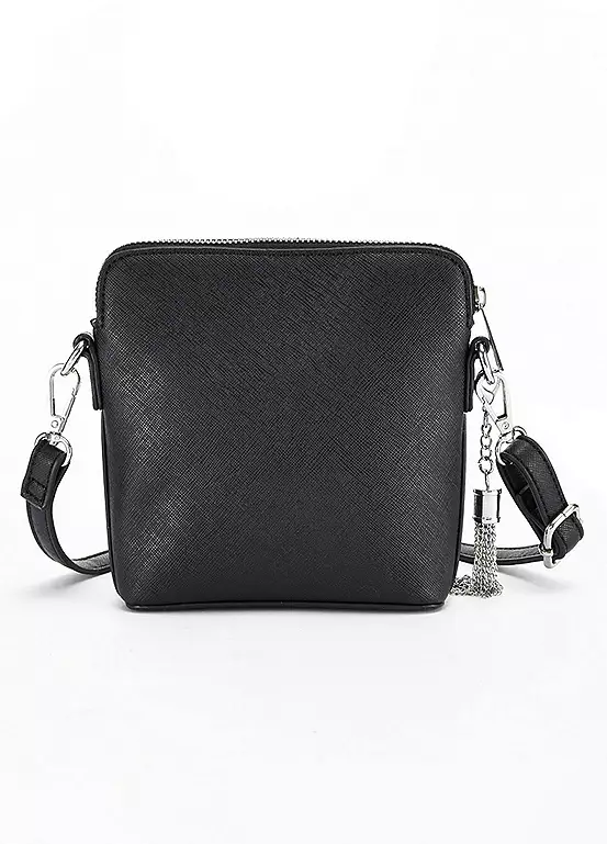 Shoulder bag in a simple, elegant design, featuring a detachable shoulder strap with a carabiner and silver coloured tassel. This bag is a chic, practical companion for your valuables. With silver colour detachable tassel. Made of imitation leather. Size approx. 16.5H x 18W x 4.5D cm (6½ x 7 x 1¾ in).