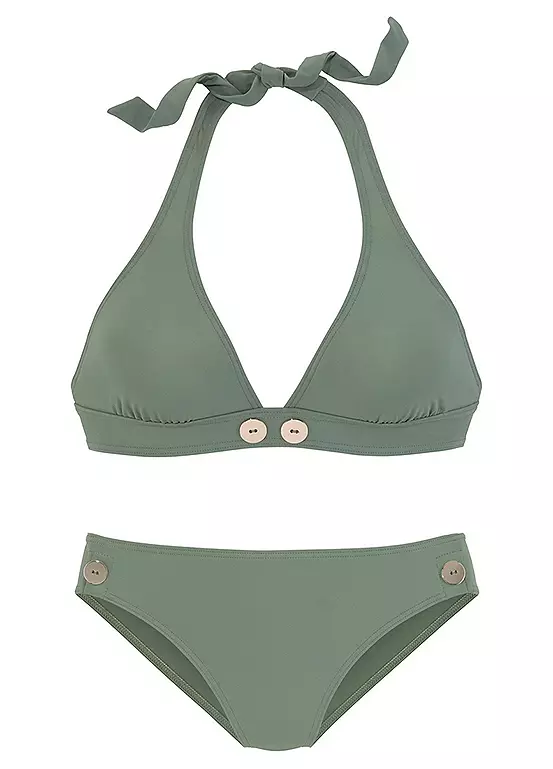 Stylish bikini featuring removable cups that conjure up a full décolleté if desired. The top ties at the neck and closes at the back. The two small buttons on the top are a cute eye-catcher, while the bikini pants are in a classic cut. Made from a quick-drying, stretchy material. Removable soft cups.
